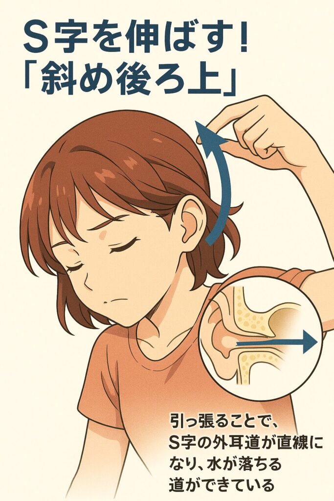 - 反対の手を頭の後ろから回し、耳の上部(耳介)をつまんで、「斜め後ろ上」に強く引っ張ります。