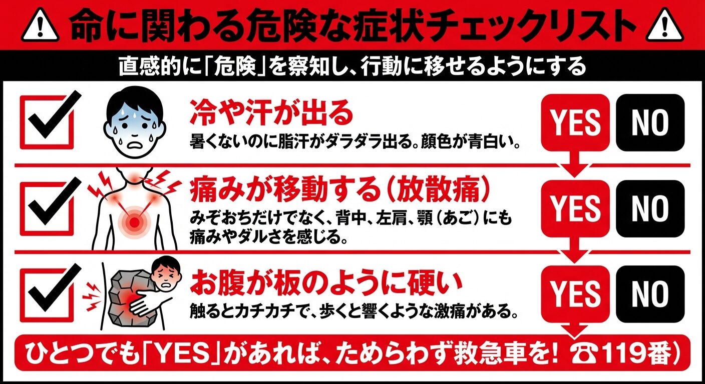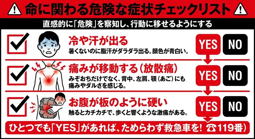 - 危険サイン(冷や汗、放散痛)があれば、迷わず119番。