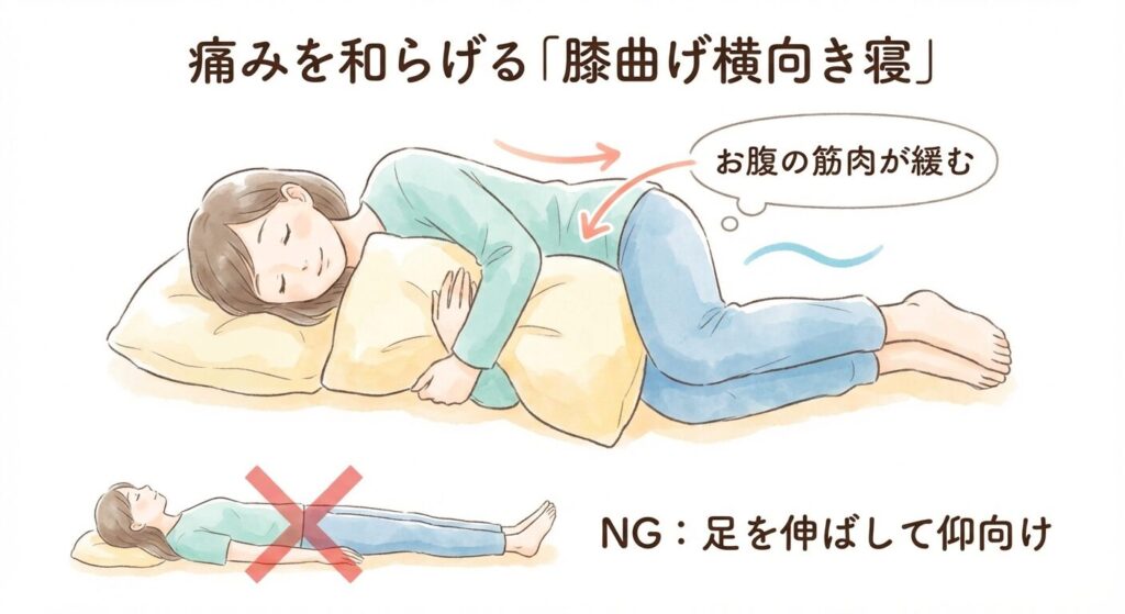 - 抱き枕を使う: 布団やクッションを抱きかかえると、お腹の圧力が分散され、さらに楽になります。