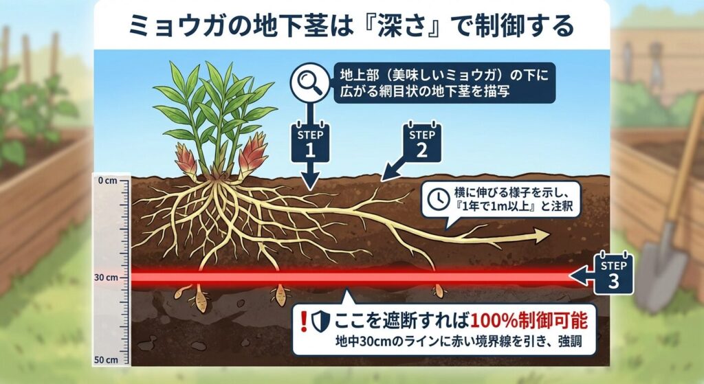 しかし、恐れる必要はありません。ミョウガの生態を科学的に分析すると、ある「弱点」が見えてきます。それは、地下茎の活動範囲が地表から深さ30cm以内に集中しているという事実です。