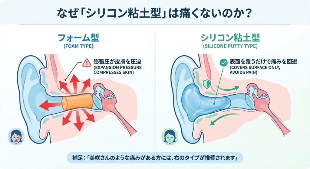 - 外耳道への過剰な圧迫: 美咲さんがお使いの「フォームタイプ(スポンジ状)」は、耳の中で膨らむ力が強く、長時間使い続けると皮膚を圧迫し、血流を阻害して痛みを生じさせます。