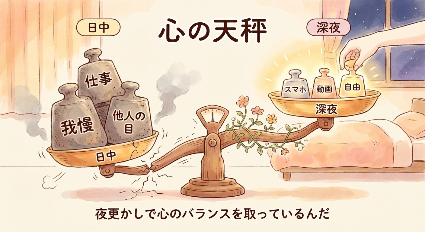 つまり、夜更かしは、日中に我慢した自分への「報復(リベンジ)」であり、自分の人生の主導権を握り返そうとする、心の必死の抵抗なのです。