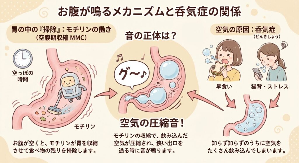 空腹時にお腹が鳴るのは、「空腹期収縮(MMC)」と呼ばれる現象です。胃の中が空っぽになると、「モチリン」というホルモンが分泌され、胃腸が次の食事に備えて食べカスやバクテリアを掃除するために強く収縮します。この時、胃の中にある空気やガスが圧縮されて音が出るのです。