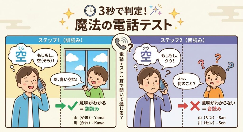 - 電話テスト: 耳で聞いて意味が通じれば訓読み。