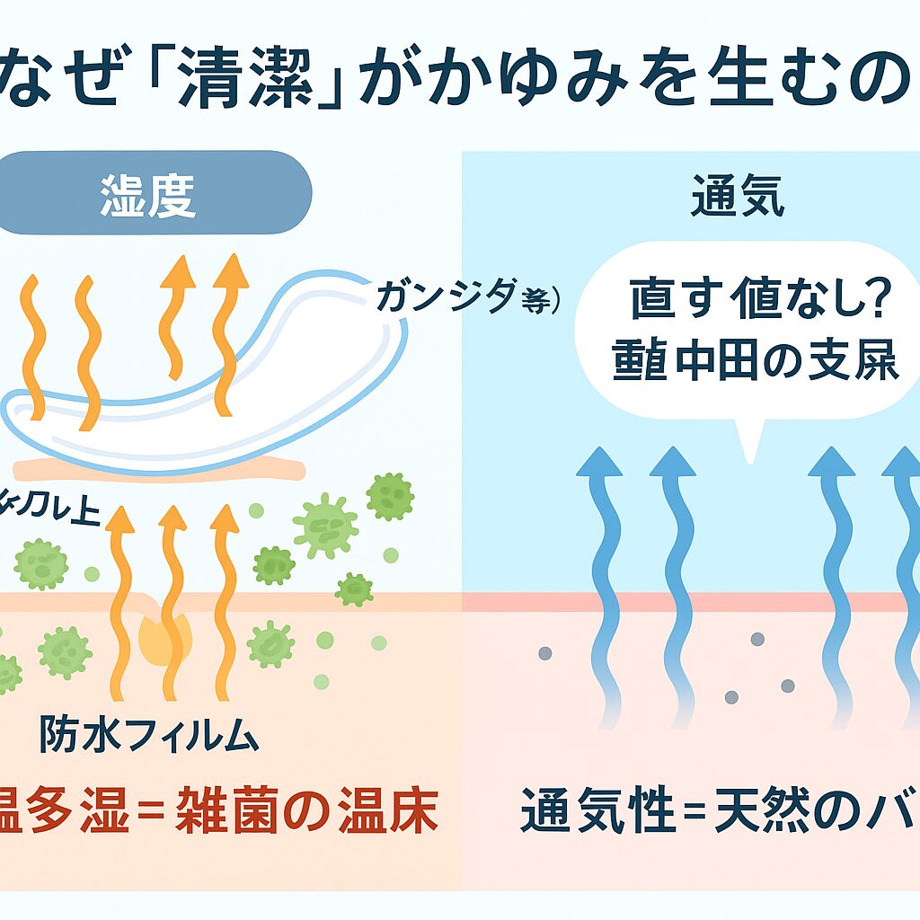 かゆいからといって、新しいシートに頻繁に変えても、それは「新しいビニール」に取り替えているに過ぎません。根本的な解決には、一度肌を「外気」に触れさせ、呼吸させてあげることが必要なのです。