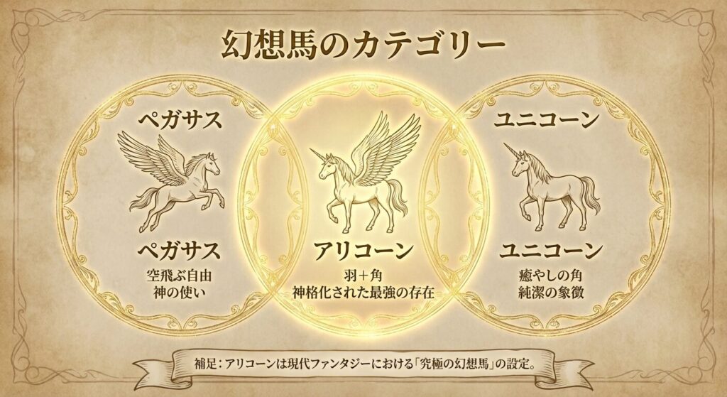 ペガサスは神話の個体、ユニコーンは伝承の種族、そして両方の特徴を持つのがアリコーン。