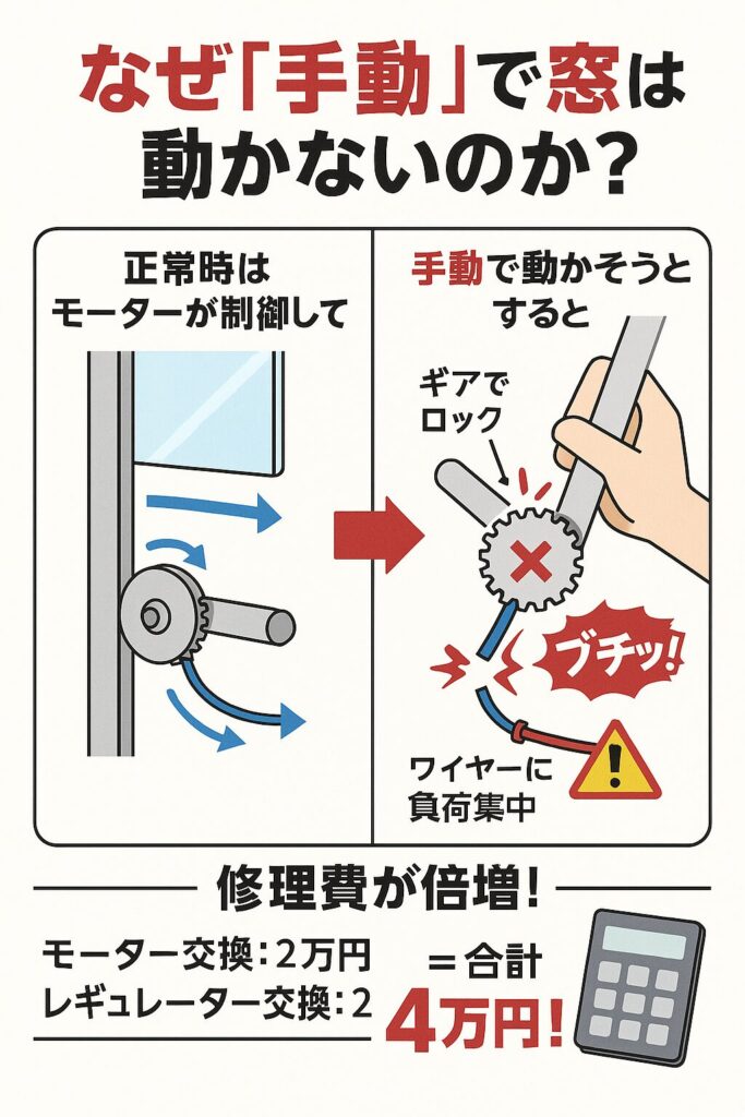 整備士として断言しますが、パワーウィンドウは構造上、外からの力では絶対に動きません。
