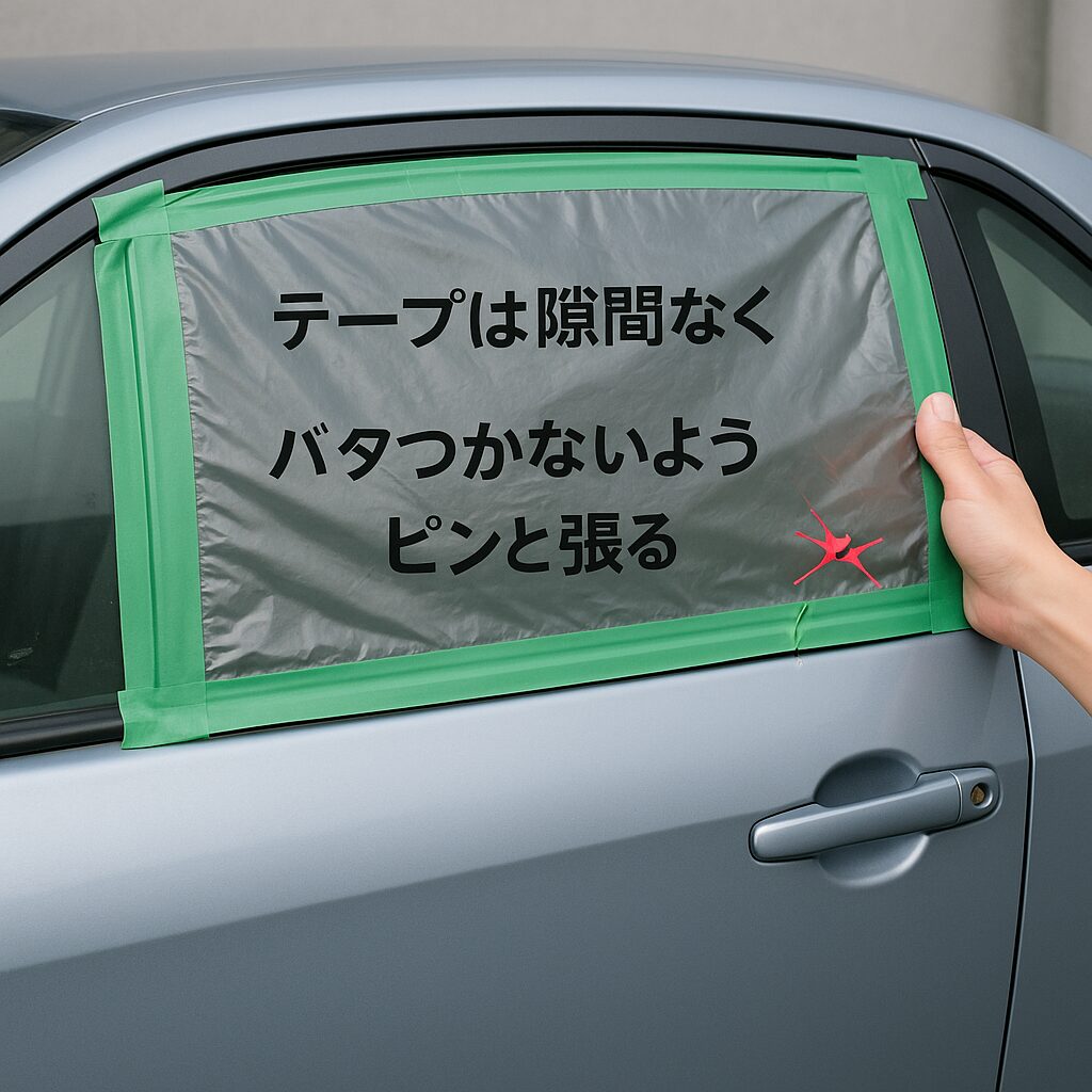3. 重要: 走行中に風で剥がれないよう、テープは「下から上」へ瓦のように重ねて貼るか、全周を隙間なく留めてください。