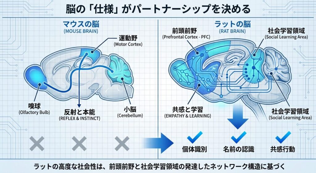 「ラットは賢い」という言葉を、脳科学的な仕様として解釈してみましょう。ラットとマウスの決定的な差は、社会性を司る脳領域の発達度合いにあります。