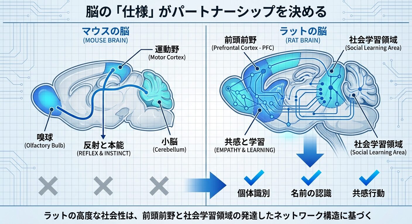 「ラットは賢い」という言葉を、脳科学的な仕様として解釈してみましょう。ラットとマウスの決定的な差は、社会性を司る脳領域の発達度合いにあります。