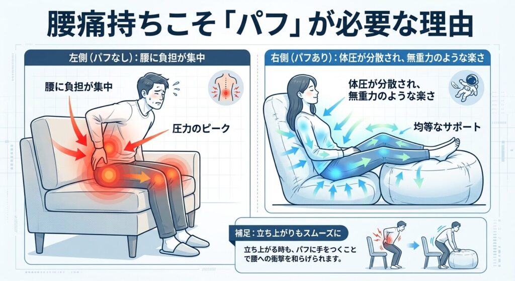 多くの方がパフを単なる「足置き」と考えていますが、腰痛持ちの方にとっては「体圧分散装置」としての役割が極めて重要です。