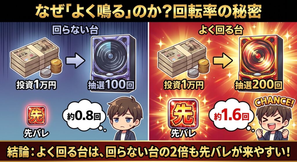 このように、よく回る台(台B)は、回らない台(台A)に比べて、同じ投資金額でも2倍の抽選を受けられます。 当然、先バレが発生するチャンスも2倍になります。