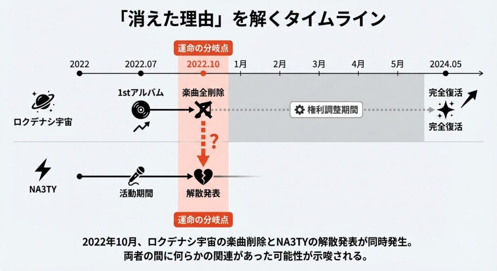 実は、ロクデナシ宇宙のメンバーである丈と、作曲を担当していたゆのは、「NA3TY」という別のグループにも所属していました。そして、ロクデナシ宇宙の楽曲が削除された2022年10月は、まさにこのNA3TYが解散を発表した時期と重なっているのです。