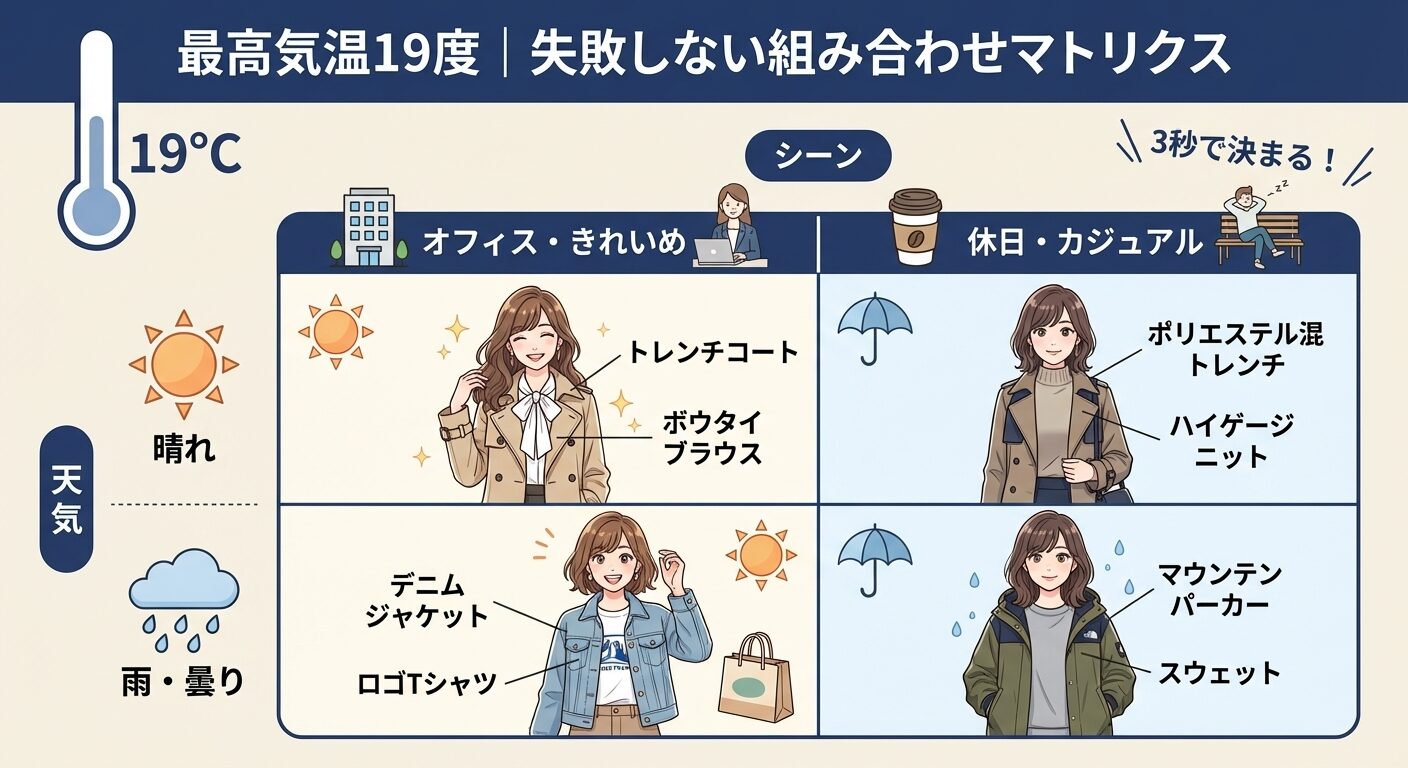 【結論】: 19度の日は、「脱ぎ着のしやすさ」を最優先してください。