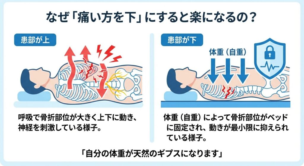 直感的には、折れた場所を下にすると重みで痛む気がしますよね。しかし実際には、自分の体重で骨折部位をベッドに押し付けることで、呼吸による肋骨の無駄な動きを封じ込める「添え木」の役割を果たします。逆に患部を上にすると、呼吸のたびに折れた骨が自由に動いてしまい、激痛が止まりません。