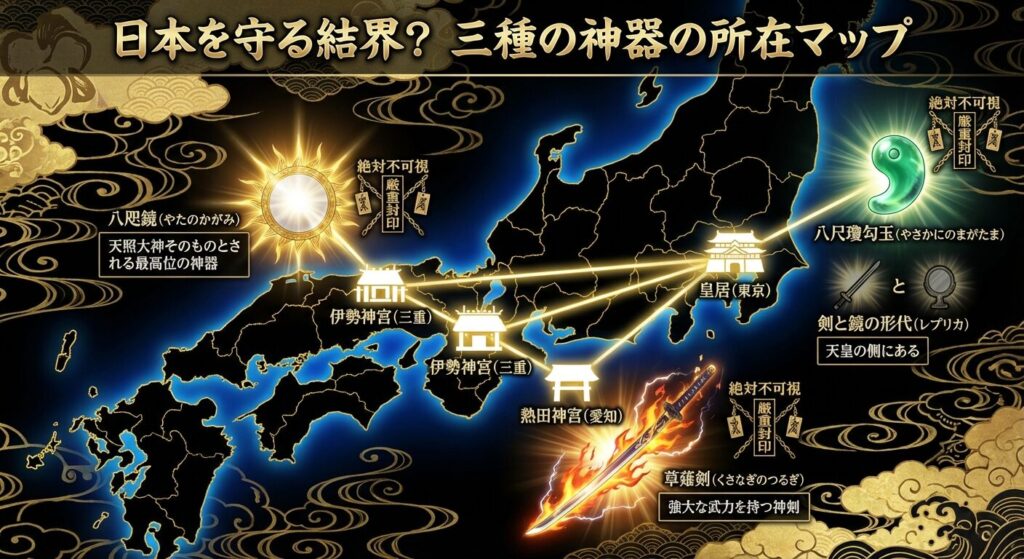 神道において、神様は形のない存在ですが、鏡や剣などの物体に宿る(依りつく)とされています。つまり、三種の神器は「神様そのもの」なのです。