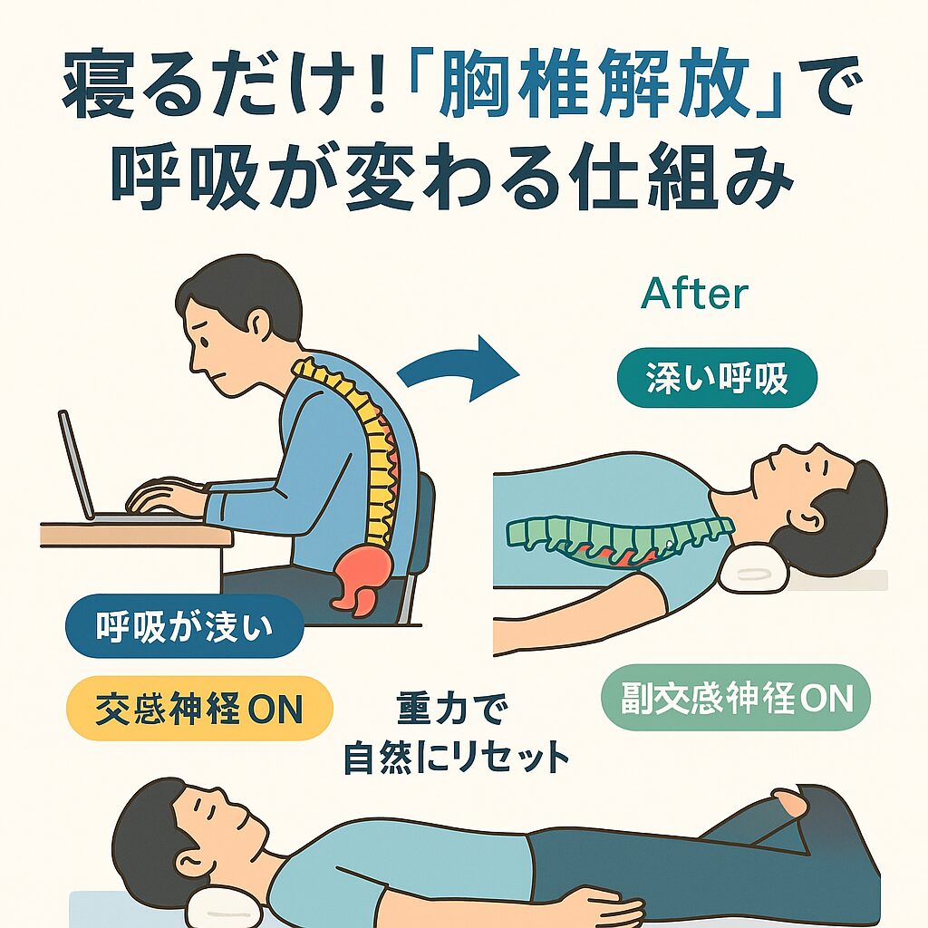 胸椎が丸まっていると、肋骨で囲まれた「胸郭(きょうかく)」が潰れ、肺が広がるスペースが狭くなります。これでは呼吸が浅くなり、自律神経が休まらず、睡眠の質まで低下してしまいます。