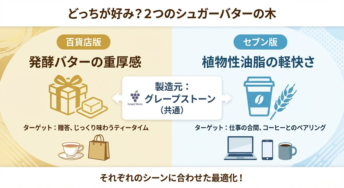 セブンのレジ前で「シュガーバターの木」を見つけ、嬉しい反面「これ、百貨店で売っているあの味と本当に同じなの?」とスマホで検索しているあなたへ。