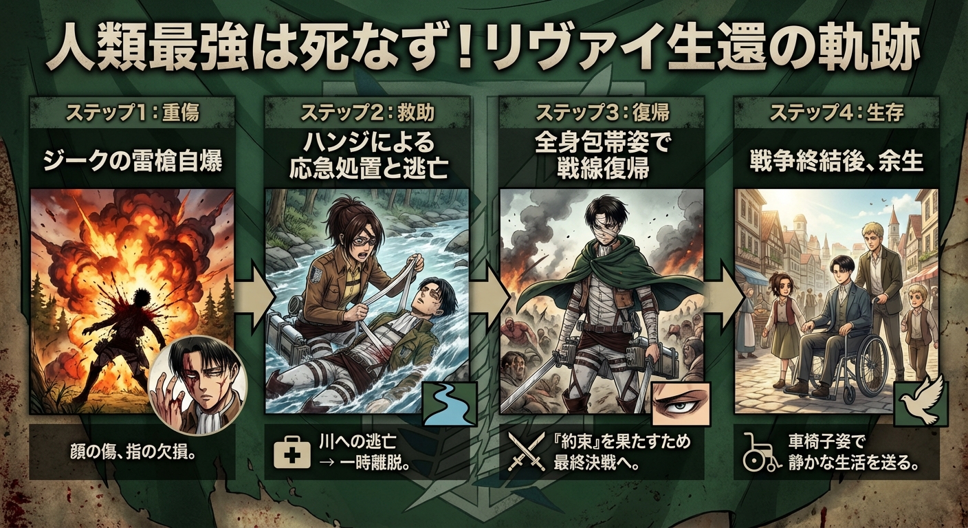 しかし、ハンジさんの懸命な処置によって一命を取り留めます。その後、全身包帯姿で戦線に復帰し、片目と片足が不自由な状態でありながら、立体機動装置を駆使して最終決戦に挑みました。まさに「人類最強」の名に恥じない、執念の生還劇でした。