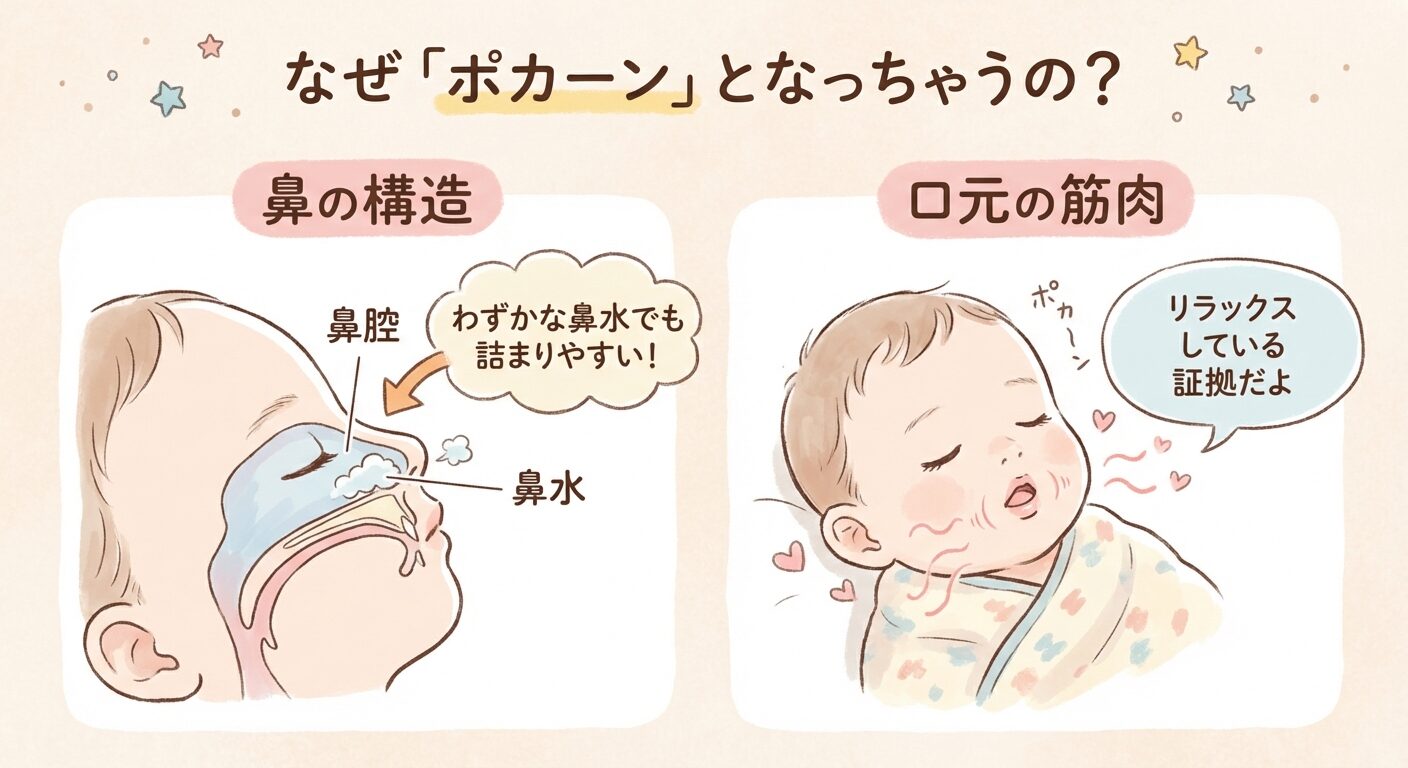 結論からお伝えすると、新生児が口を開けて寝る原因の多くは、赤ちゃんの体の未熟さによる「生理的なもの」であり、緊急性は低いことがほとんどです。