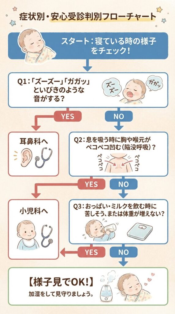 2. いびき、陥没呼吸、飲みが悪いなどの「レッドフラッグ」がなければ様子見でOK。