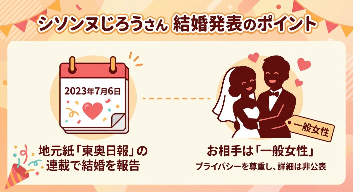 読者の方が最も知りたいであろう、シソンヌじろうさんの結婚という行動について、まずは事実を簡潔にお伝えします。じろうさんの所属事務所である吉本興業も公式に認めている情報です。