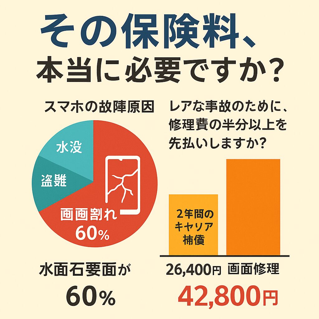 確かに、2年落ちの端末に月額1,000円以上のキャリア補償を払い続けるのは、資産価値から見て「払い過ぎ」です。しかし、だからといって「無保険」でいることが、数学的に正しい選択かというと、それもまた違います。
