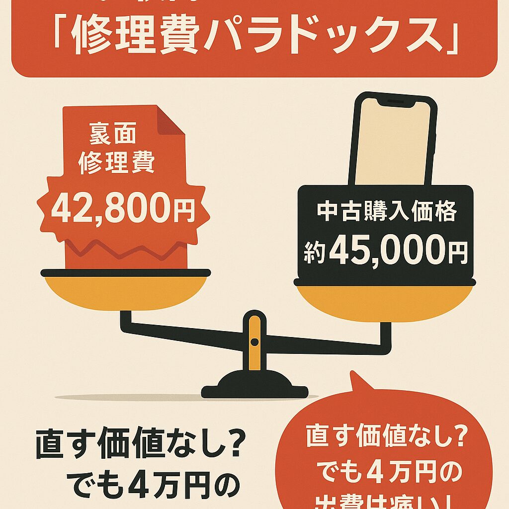 まさにその通りなのです。ここに、iPhone 13の「修理費用」と「中古相場」がほぼ同額になってしまうという、厄介なパラドックス(逆説)が存在します。