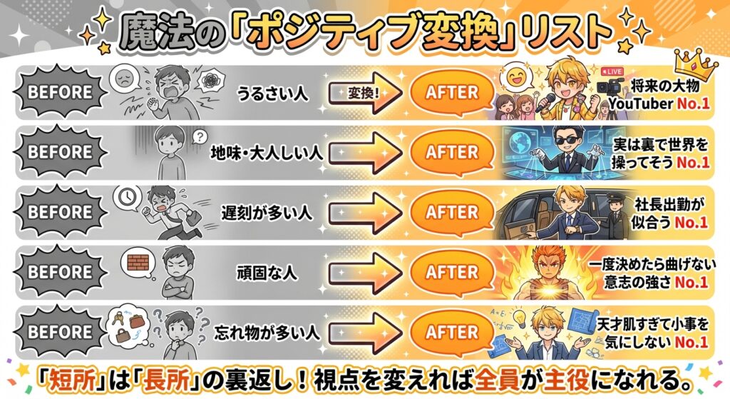 それは、ネガティブな特徴をポジティブな称号に変換することで、将来の恥(黒歴史)を防ぎつつ、全員を主役にする「ポジティブ変換ランキング」です。