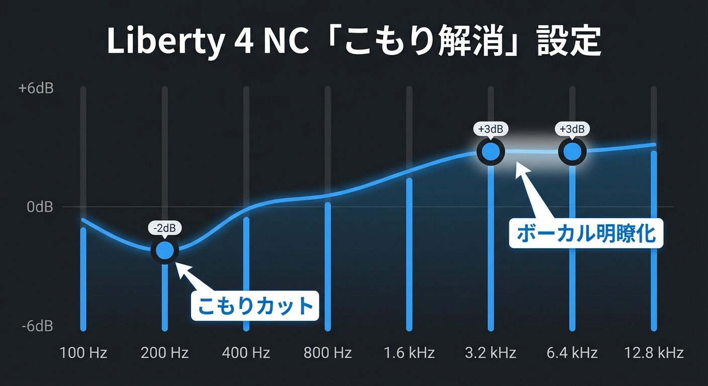 Liberty 4 NCの最大の課題は、ANCの副作用と過剰な低音による「こもり」です。これを解消するには、中低音を大胆に削り、埋もれていた高音を引き上げる「足し算と引き算の組み合わせ」が必要です。