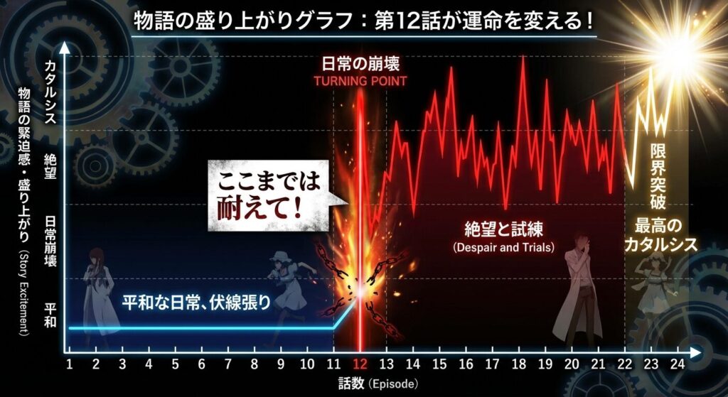 『シュタインズ・ゲート』は、序盤の退屈さも、中盤の絶望も、すべてはラストの感動のために計算され尽くした「完璧な脚本」で構成されています。