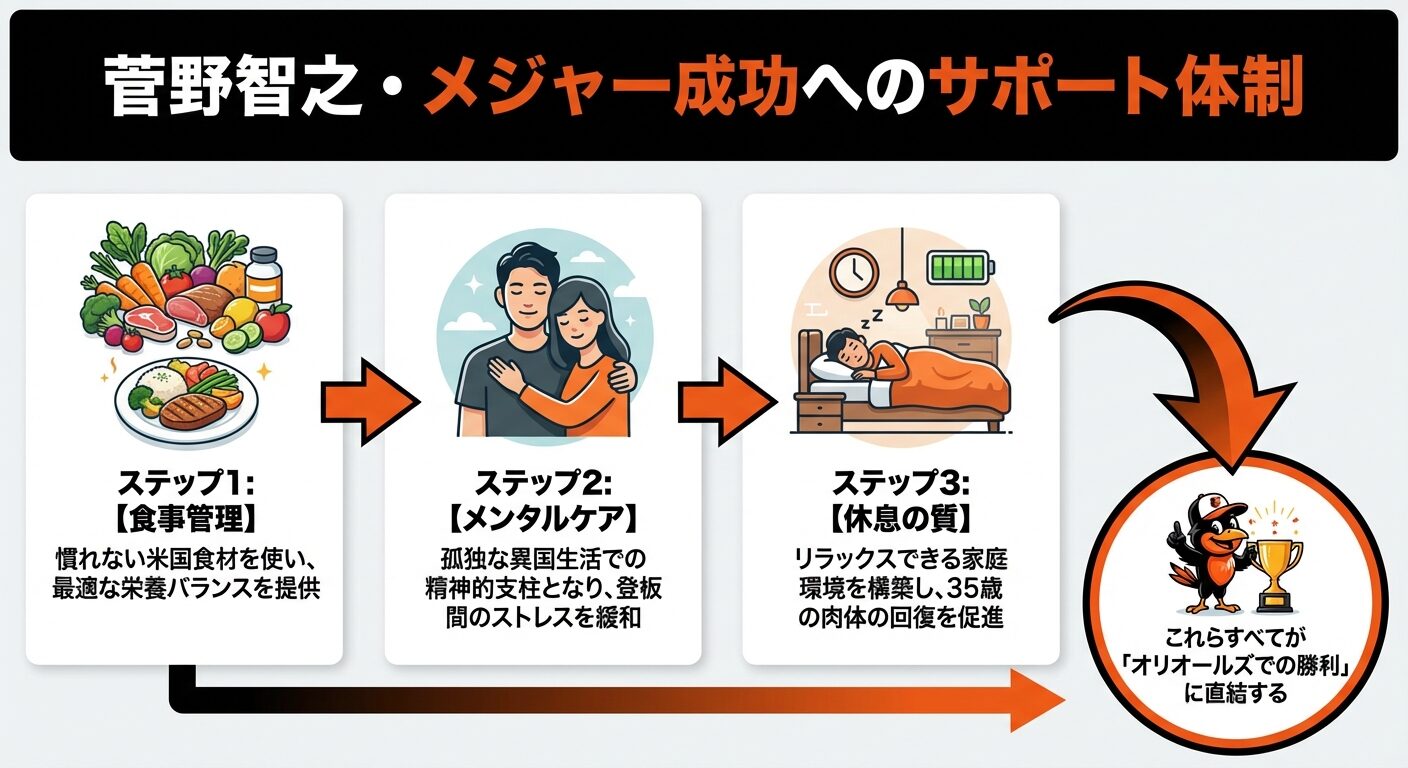 ベテラン選手が異国の地で成功するためには、アスリートフードマイスター級の知識を持ったパートナーの存在が不可欠です。この一般女性が渡米に同行することで、菅野智之投手は野球に100%集中できる環境を手に入れることができます。