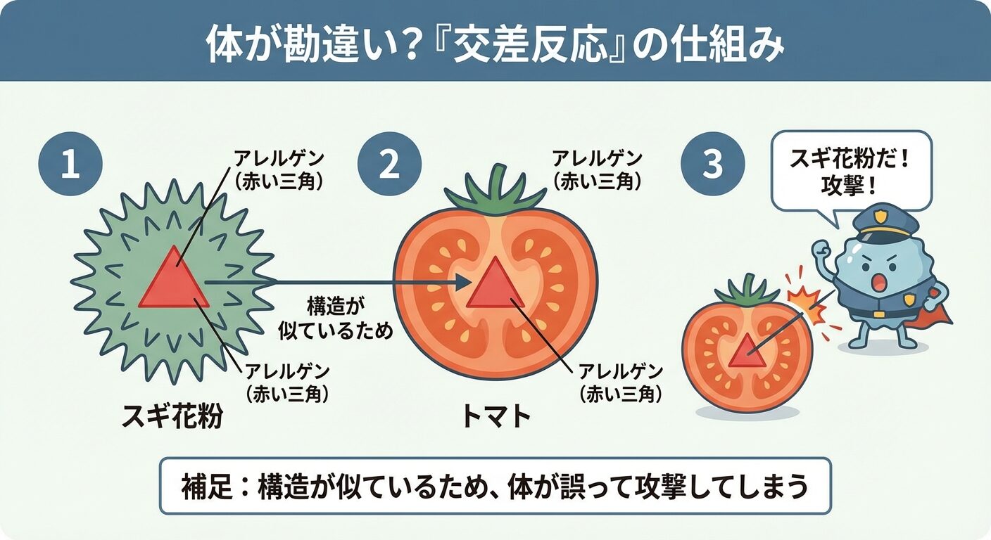 スギ花粉に含まれるアレルゲン(アレルギーの原因物質)と、トマトに含まれるアレルゲンのタンパク質構造は、非常によく似ています。そのため、あなたの体にある免疫システムが、入ってきたトマトを「あ!スギ花粉が来た!」と誤認して攻撃してしまうのです。