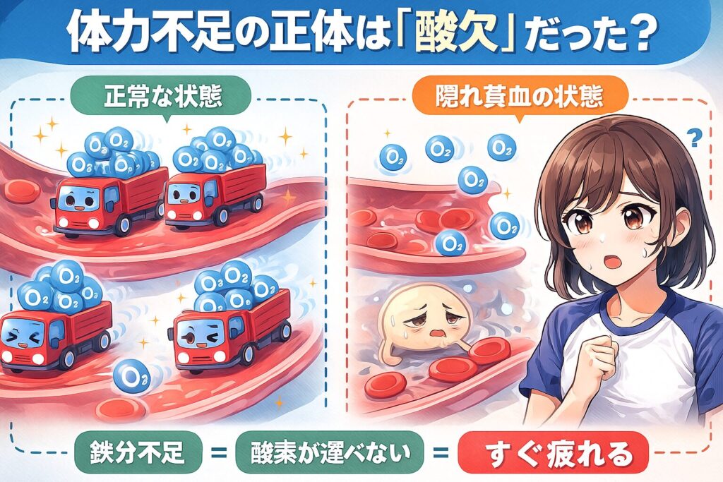 私たちは毎月の月経で大量の鉄分を失っています。鉄分は、血液中で酸素を運ぶ「ヘモグロビン」の材料です。つまり、鉄分不足(隠れ貧血)の状態とは、体が常に「酸欠」になっている状態を指します。