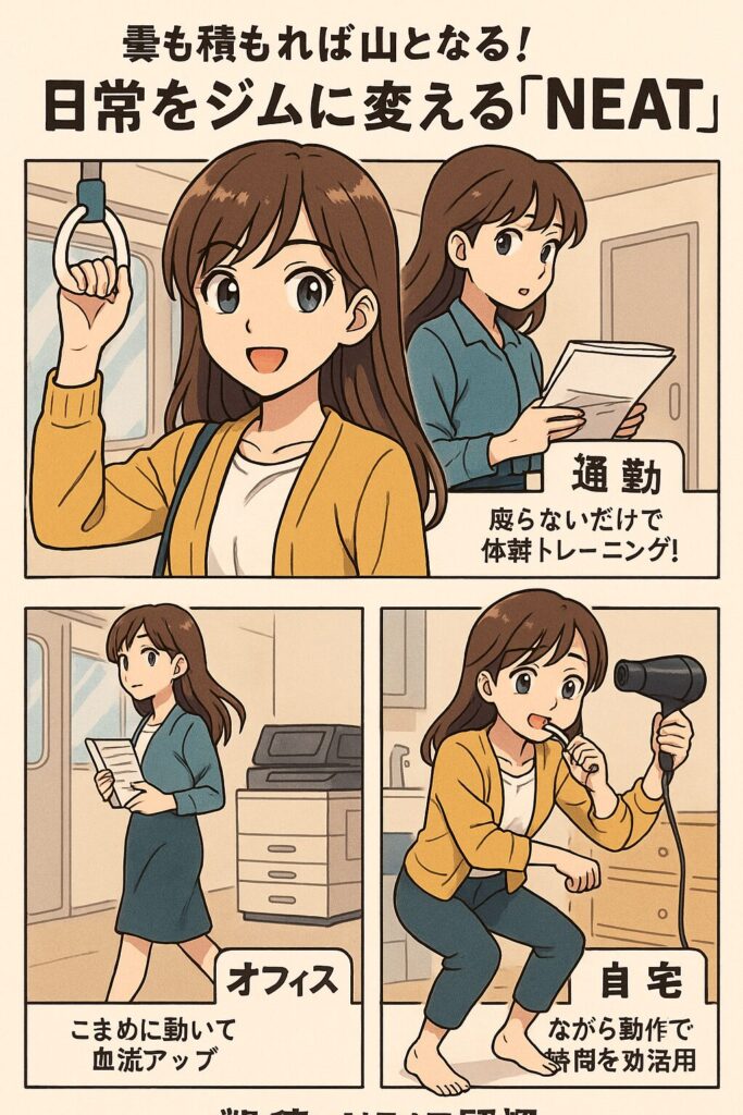 NEAT(非運動性熱産生)とは、家事や通勤、仕事中の姿勢など、日常生活で消費されるエネルギーのことです。