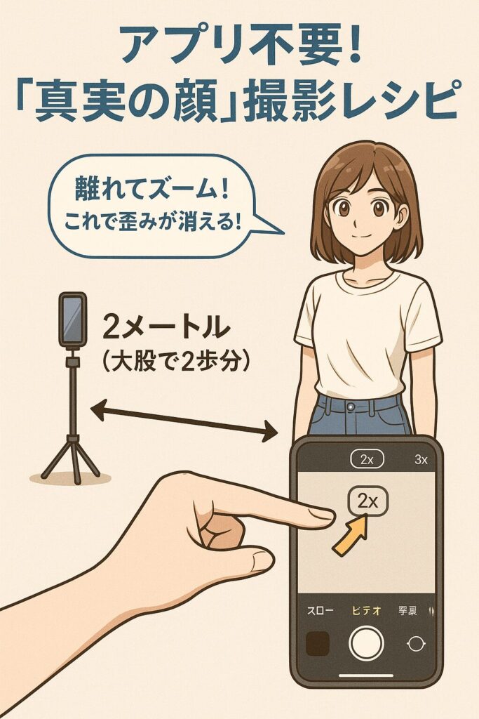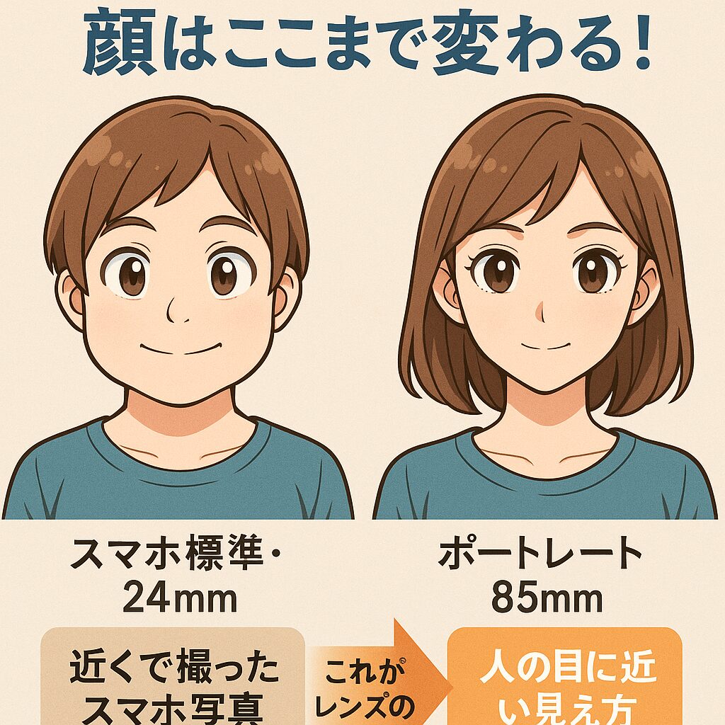 なぜなら、プロの現場でも、人物を美しく撮るために広角レンズ(24mm)を使うことはまずありません。私たちは通常、歪みの少ない中望遠レンズ(85mm前後)を使います。つまり、スマホの標準カメラで撮っている時点で、あなたは「プロでも可愛く撮るのが難しい不利な条件」で戦っているのと同じなのです。
