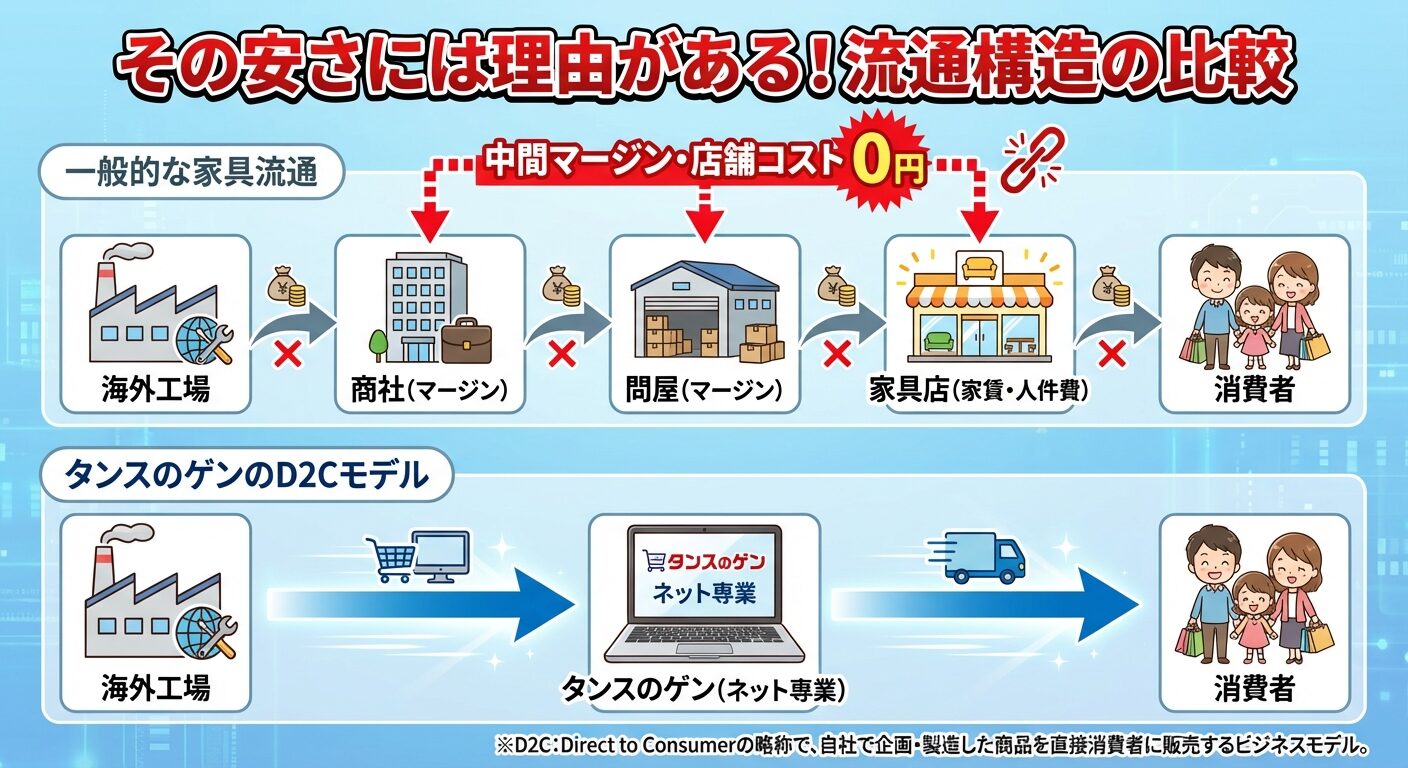 そう疑うのは消費者として健全な反応です。しかし、タンスのゲンの安さには、経済合理性に基づいた明確な理由があります。
