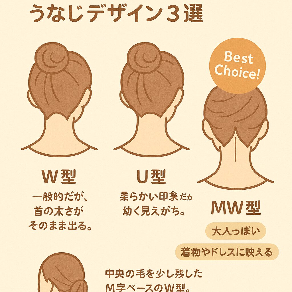 うなじのデザインには、大きく分けて「W型」「U型」「MW型」などがありますが、首を最も細く、長く見せてくれるのが「MW型」です。