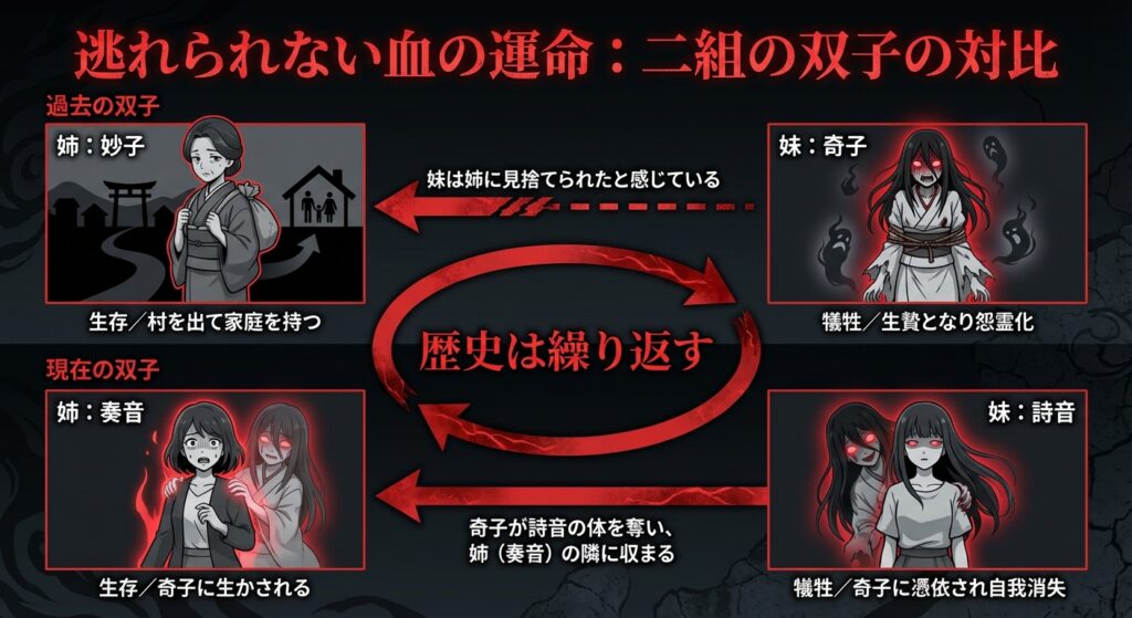かつて姉(妙子)が生き残り、妹(奇子)が犠牲になったように、今回もまた、姉(奏音)が生き残り、妹(詩音)が犠牲になるというルールが厳密に適用されてしまったのです。