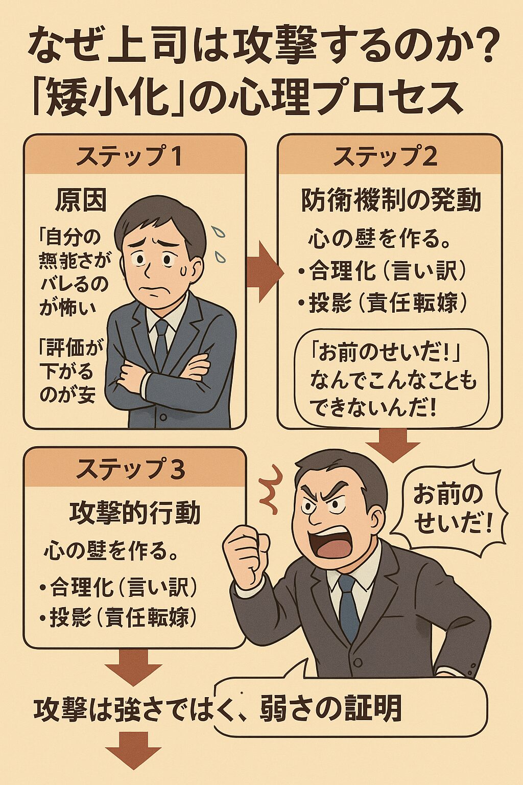 つまり、上司の攻撃性は、「矮小な人間」であるという原因が引き起こした、「防衛機制」という結果に過ぎないのです。