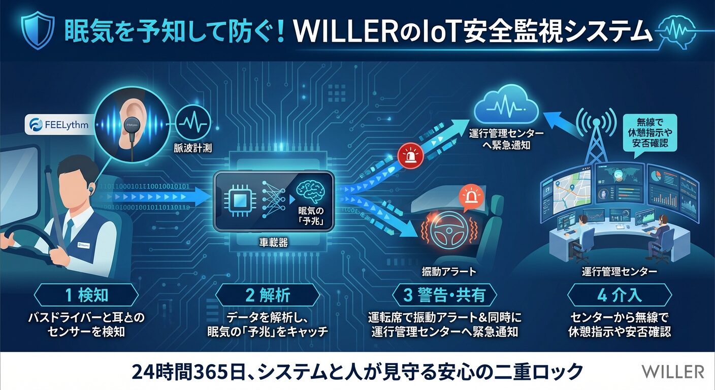 「運転手が居眠りしたらどうするの?」という質問に対し、WILLERは「人間任せにしない」ハイテクな回答を用意しています。