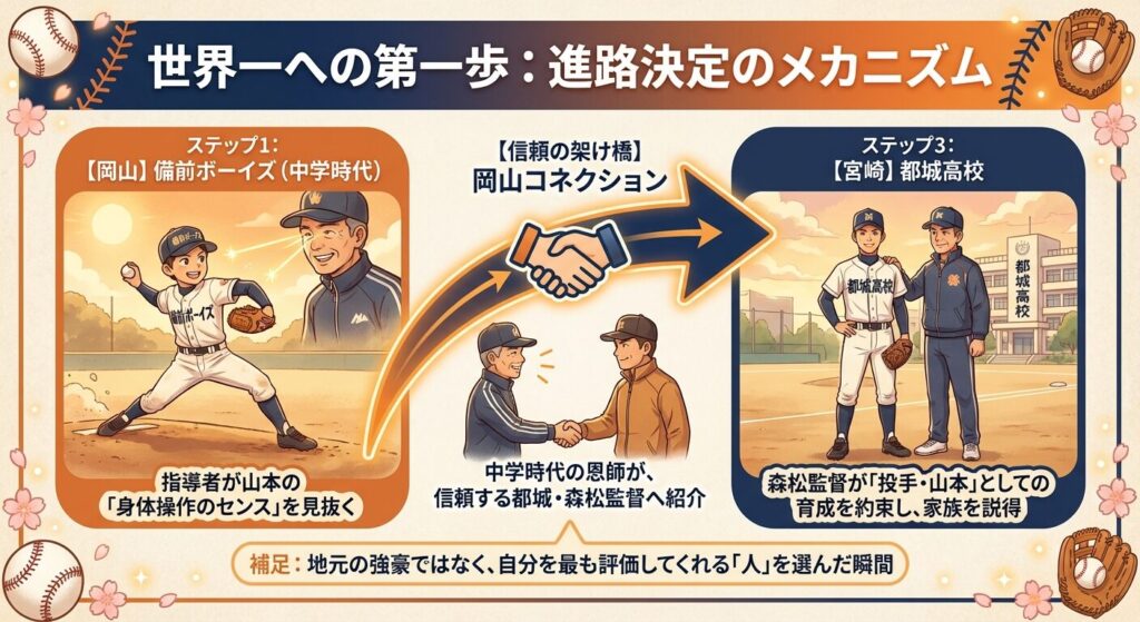 山本由伸投手が都城高校へ進んだ最大の理由は、中学時代に所属していた「備前ボーイズ(当時の東岡山ボーイズ)」の指導者と、都城高校の森松賢一監督(当時)との間にあった強固な信頼関係、通称「岡山コネクション」にあります。